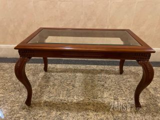 欧陆古典红木雕花(实木连批花玻璃面及木雕沿边和脚), 4脚呈弧形, 连精致雕刻, 茶几沿边有细致雕刻. 玻璃面有多面切割, 反射光线, 更具气派. 90cm 阔 x 50cm 深 x 54cm 高