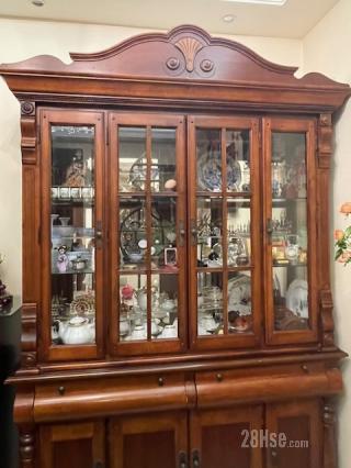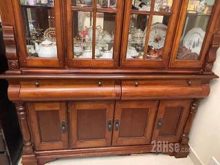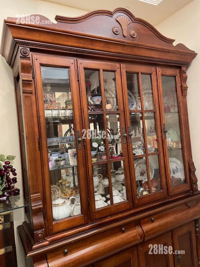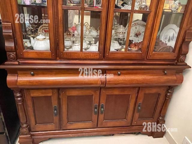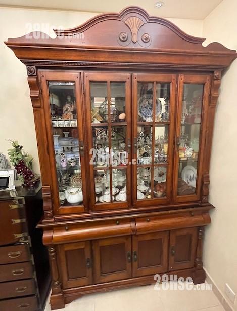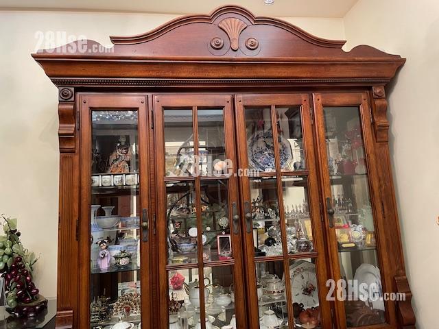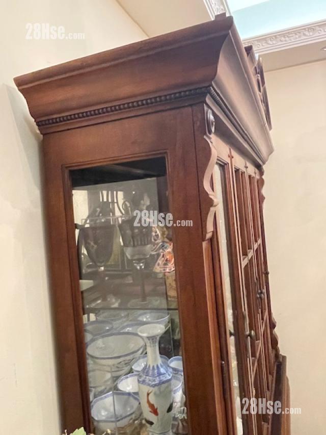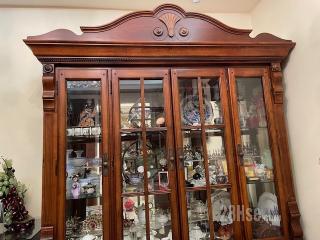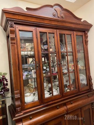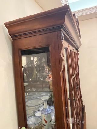 美国古典家俬名牌 Universal Furniture 欧陆经典红木古典玻璃门装饰品展示柜, 内有多层玻璃架, 柜背有大镜, 可反射装饰品 如水晶, 晶莹剔透, 美轮美奂. 气派非凡. 中间有圆拱形抽屉, 下方柜门内有大量储物空间, 豪华实用俱备. 令饭厅格调大大提升.