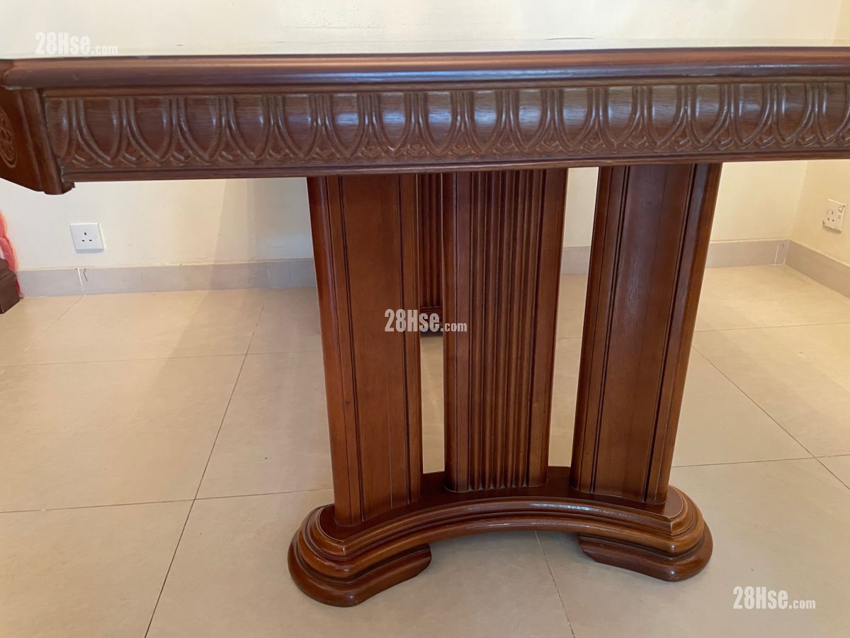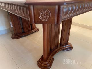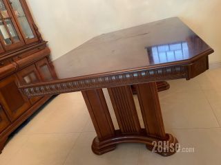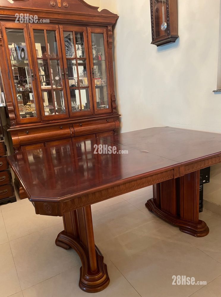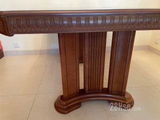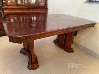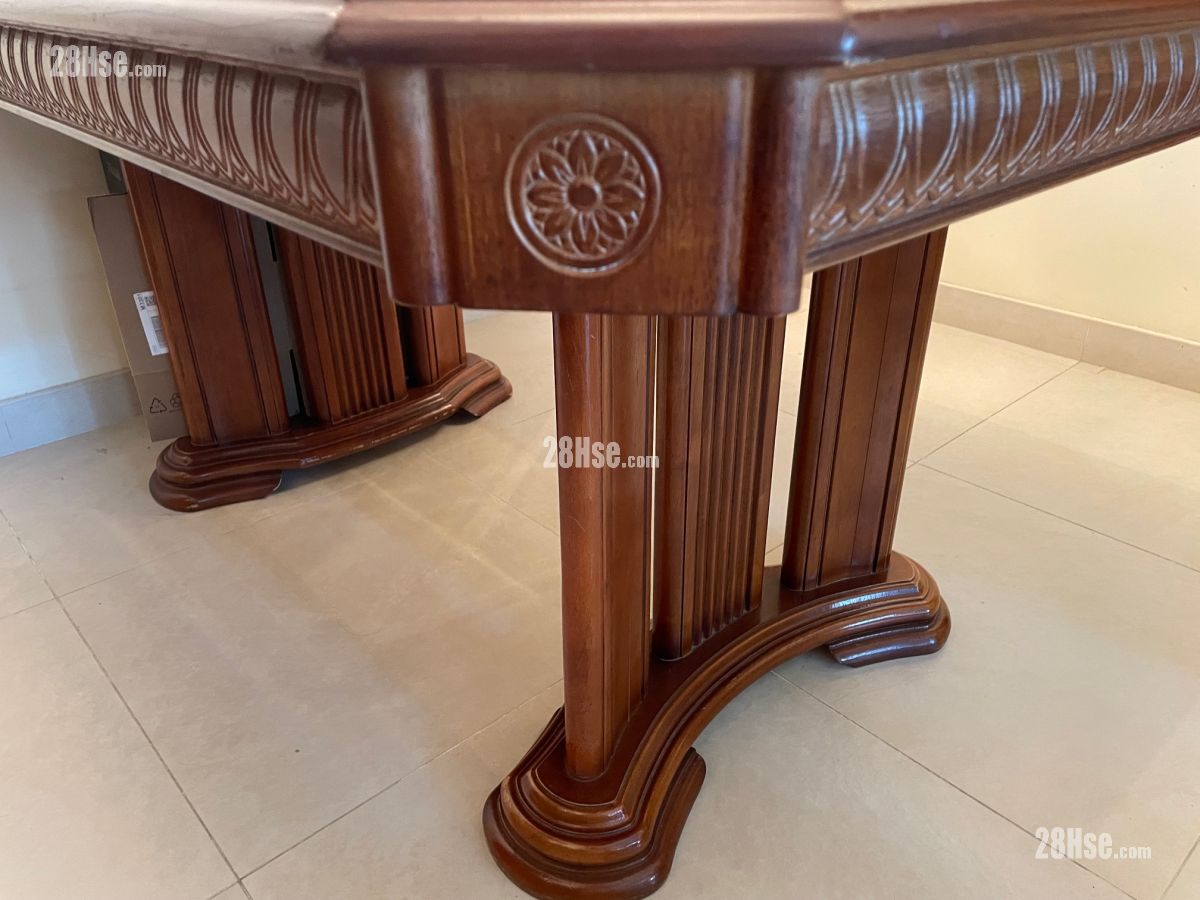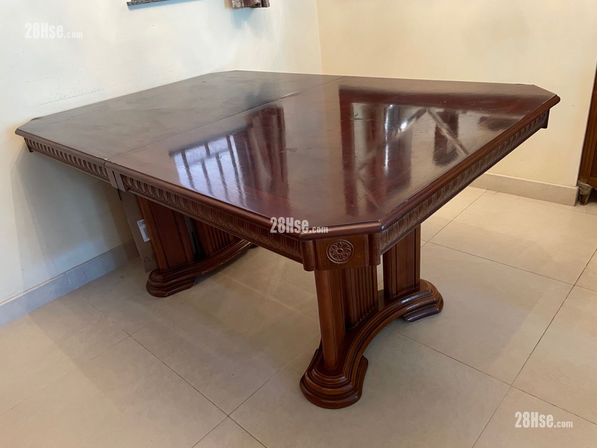美国名牌Universal 欧陆红木经典大型餐桌, 163 x 106cm (未扩张) (扩张后约193 x 106cm) , 桌中央可加扩张部分 (可分开收藏). 角位呈八角形, 桌边精致雕刻, 桌底也有欧陆雕刻, 实木稳重, 气派不凡.
