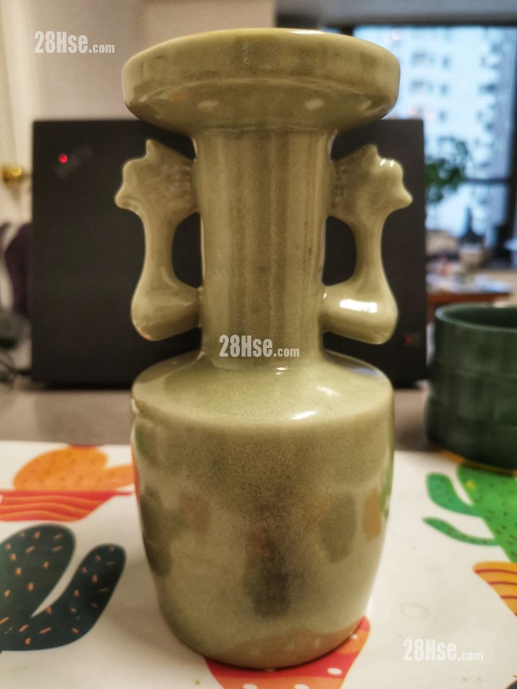 瓶身呈橄榄绿色,带有纹理,并有两个类似龙头的把手。瓶口宽大,底部较小,整体造型优雅。适合用于装饰或收藏。